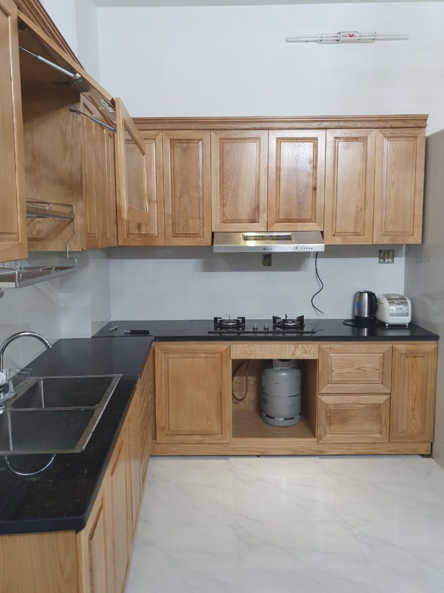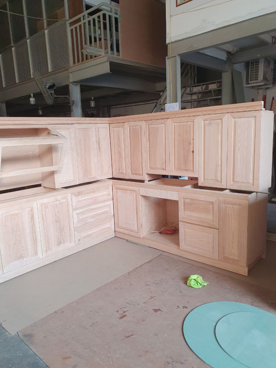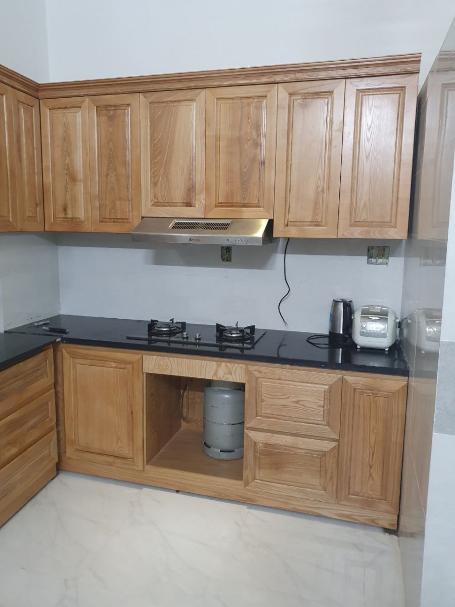 Tủ bếp trên và tủ bếp dưới bằng gỗ sồi phủ veneer sơn bóng tự nhiên